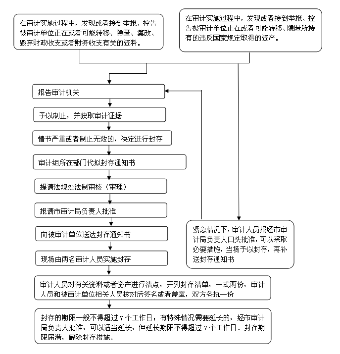 6.封存。审计机关采取封存措施时,应当由两名以上审计人员会同被审计单位相关人员对有关资料或者资产进行清点,开列封存清单。